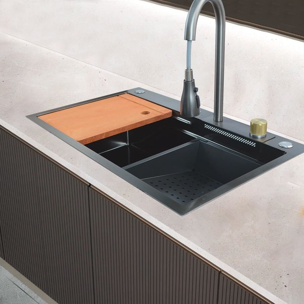 Esta cuba oferece muito mais do que uma simples pia. Com um design inteligente, inclui uma torneira com duplo jato, perfeita para limpeza eficiente, e uma cascata para lavagem, proporcionando um toque de sofisticação à sua cozinha. A tábua de corte e o cesto de lavagem removível tornam a preparação e a limpeza ainda mais práticas e organizadas.
