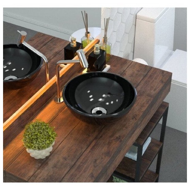 1 Cuba de Apoio, 1 Torneira de mesa alta, 1 Válvula de Escoamento, 1 Sifão PVC Universal Branco, 1 Engate Flexível 40cm