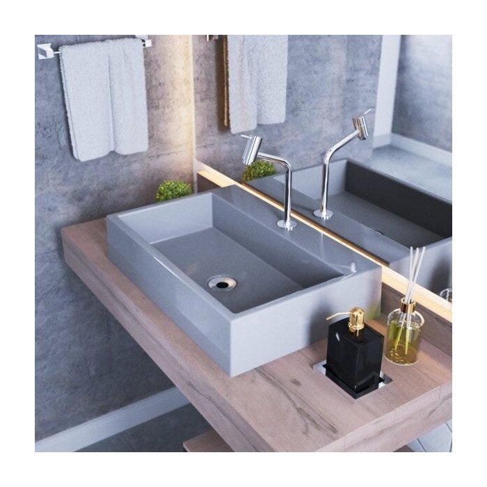 1 Cuba de Apoio, 1 Torneira de mesa baixa, 1 Válvula de Escoamento, 1 Sifão PVC Universal Branco, 1 Engate Flexível 40cm