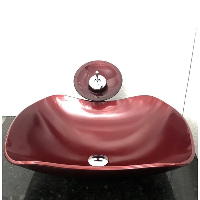Dimensões: 53 x 39 x 14cm material: vidro. kit com cuba de vidro de sobrepor abaulada, válvula click cromada para lavatórios e torneira cascata redonda de vidro temperado vermelho