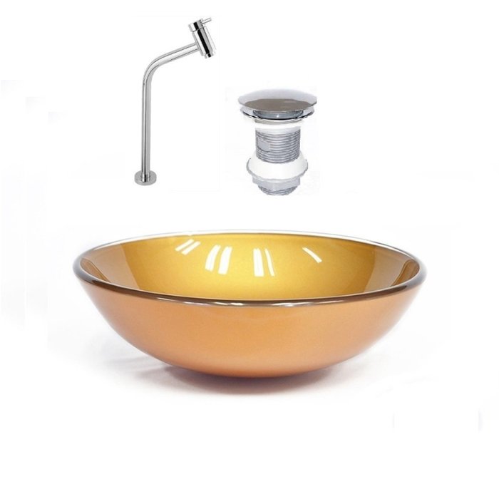 Kit Cuba Vidro Redonda 31cm Torneira e Válvula Dourado Real
