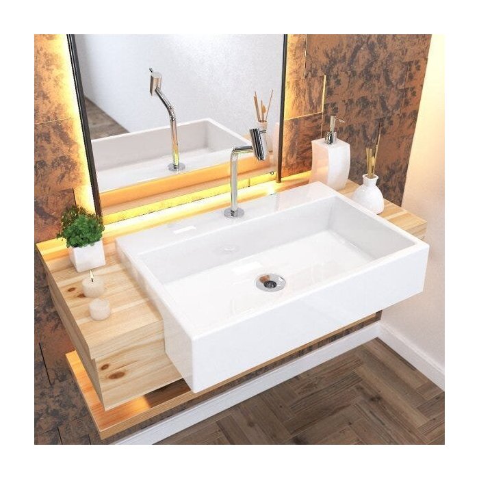 1 Cuba de Apoio, 1 Torneira de Mesa Baixa, 1 Válvula de Escoamento, 1 Sifão PVC Universal, 1 Engate Flexível e Manual de Instalação
