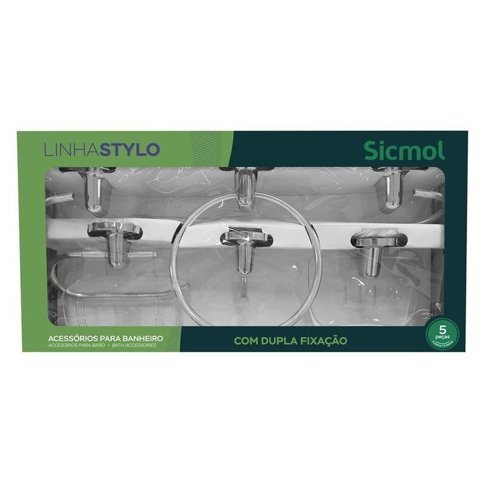A Sicmol é uma empresa com ''know how'' e tecnologia avançada na fabricação de móveis e acessórios para banheiro. A marca está presente no mercado desde 1988, contando com uma diversificada linha de produtos, pronta para atender as mais variadas necessidades de seus consumidores de móveis, acessórios e revestimentos.Quantidade de Peças: 5 | Cor: Prata | Acabamento: Cromado | Peso (kg): 0,285 | Referência do Produto no Fornecedor: 1533 | Tipo de Fixação: Acompanha parafusos e bucha para Fixação | Produto: Kit para Banheiro Stylo com 5 Peças | Informações Adicionais: Informações e dados são de responsabilidade do fornecedor. | Local Indicado: Banheiro | Linha: Stylo | Marca: Sicmol | Dimensões Aproximadas do Produto com Embalagem (cm) - AxLxP: 8 x 23 x 45 cm | Conteúdo da Embalagem: 1 Cabide, 1 Saboneteira, 1 Papeleira, 1 Porta Toalha Rosto, 1 Porta Toalha Banho | Garantia (Mês): 60 | Material: Alumínio Maciço com Acabamento em ABS