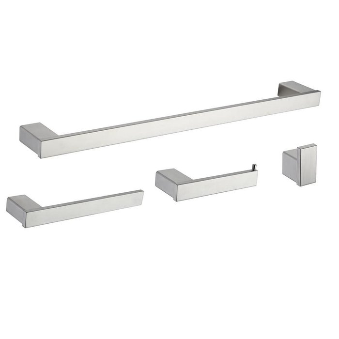 Kit de Acessórios Para Banheiro Escovado Kit de acessório para banheiro 4 peças: cabide, porta papel higiênico, porta toalha de rosto e porta toalheiro de banho barra . Modelo quadrado, acabamento Inox Escovado, fixação com parafuso invisível (Parafuso e furação ficam ocultas após a instalação). Fabricado em metal de alta qualidade e resistência, acompanha kit de fixação (inclusive chave allen). Material de excelente qualidade, com design moderno, prático e funcional. Pensado para facilitar o seu dia-a-dia e valorizar seu ambiente.