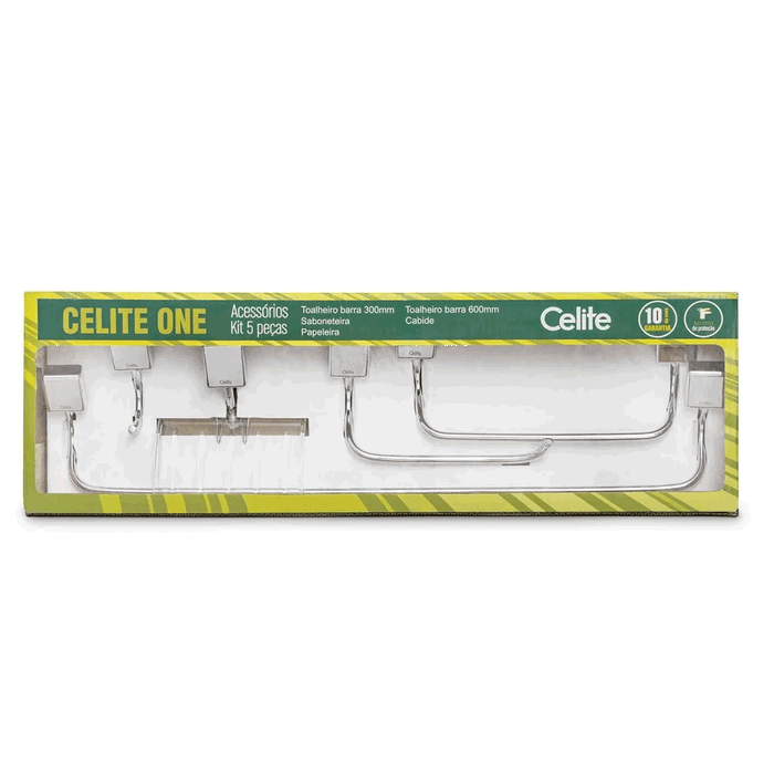 KIT DE ACESSORIOS COM 5 PEÇAS SUITE CROMADO - CELITE O kit de acessórios com 5 peças Suite Cromado da Celite é a solução completa para aprimorar o seu banheiro com estilo e funcionalidade. Com um acabamento cromado elegante e moderno, este conjunto adiciona um toque de sofisticação a qualquer ambiente. O kit inclui cinco peças essenciais para o seu banheiro: porta-toalhas, cabide, porta-papel higiênico, porta-shampoo e saboneteira. Cada peça é cuidadosamente projetada para oferecer durabilidade e resistência, além de fácil limpeza e manutenção. Seja para um banheiro residencial ou comercial, o kit de acessórios Suite Cromado da Celite combina beleza e praticidade para atender às suas necessidades diárias com estilo.