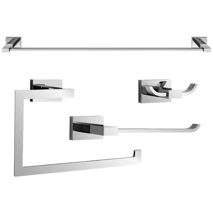 O Kit de Acessórios para Banheiro Mondrian Cromado é composto por 4 metais sanitários: Porta toalhas de rosto, porta toalhas banho, cabide e papeleira. Todas as peças possuem acabamento espelhado, sendo ideais para uso em banheiros ou lavabos.