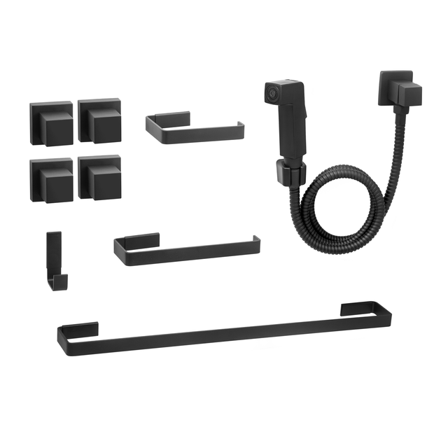 KIT ACESSÓRIOS PARA BANHEIRO 4 PEÇAS PRETO FOSCO BLACK AÇO INOX QUADRADO
