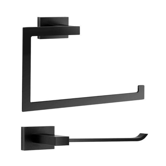 O Kit de Acessórios para Lavabo Top Mondrian Preto Fosco é composto por 2 metais sanitários: porta toalha de rosto e papeleira. Todas as peças possuem acabamento fosco na cor preta, sendo ideais para uso em banheiros ou lavabos.