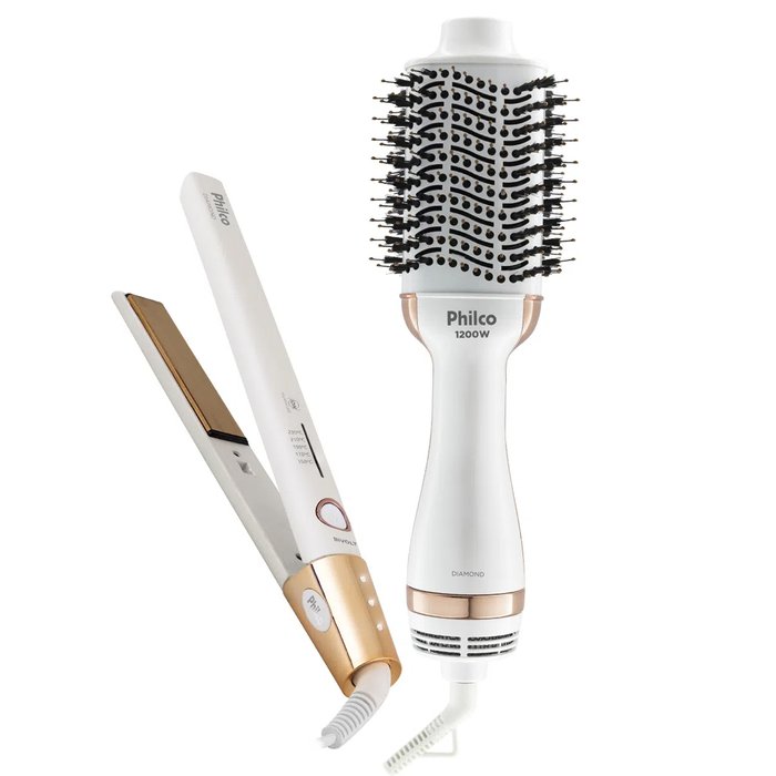 Kit de Beleza Escova Secadora Philco + Prancha PKT3100 Diamond Tourmaline Íon Escove, seque, alise e modele com grande facilidade os seus cabelos, com o Kit Philco PKT3100 Diamond. O Kit conta com uma Escova Secadora Philco Diamond de alta performance de secagem e formato ideal para modelar e alisar os seus fios, da forma que você deseja! Além disso, acompanha a Prancha Diamond 230°C Bivolt, com chapas antiaderentes flutuantes para todos os tipos de cabelo e revestimento em titanium, para o alcance de altas temperaturas. A prancha possui também tecnologia tourmaline íon que reduz o frizz nos cabelos e 5 temperaturas ajustáveis. Características Gerais: Escova Secadora Philco Diamond: - Três opções de temperatura e duas opções de velocidade; - Pode ser usado como secador de cabelos; - Cordão de alimentação de 1,8 metros; - Anel pendurador, que facilita o uso; - Cerdas com pontas emborrachadas; - Cordão giratório (360°); - Libera íons tourmaline; - Revestimento do tubo de aquecimento em cerâmica; - Formato oval: perfeita para secar alisar e modelar; - Aberturas de ventilação: ideais para a passagem do calor; Prancha Diamond 230°C Bivolt: - Placas com revestimento esmaltado; - Chapas extensas com revestimentos em titânium: super lisas com alcance de altas temperaturas; - Chapas flutuantes: adaptam-se perfeitamente ao cabelo e proporcinam excelente desempenho no alisamento; - Seletor de temperatura com 5 temperaturas disponíveis: 150°C, 170°C, 190°C, 210°C e 230°C; - Aquecimento com PTC; - Luz indicadora de funcionamento na cor branca; - Desligamento automático após 1h; - Cordão elétrico de 1,80M; - Bivolt automático; - Ion tourmaline; Ficha Técnica: - Marca: Philco - Modelo: Kit Philco PKT3100 Diamond - Cor: Branco/Gold - Peso aprox.: 550g - Voltagem: 110V ou 220V (Não é Bivolt) Garantia do Fabricante: 1 ano Conteúdo da Embalagem: - 01 UN Escova Secadora Philco Diamond - 01 UN Prancha Diamond 230°C Bivolt - 01 UN Manual e Certificado de Garantia Acompanha nota fiscal e certificado de garantia válido em todo o País.