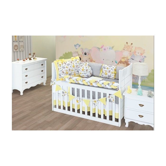 Kit de Berço Protetor Trança Safari 12 peças com Bandeirola - Amarelo Neutro
