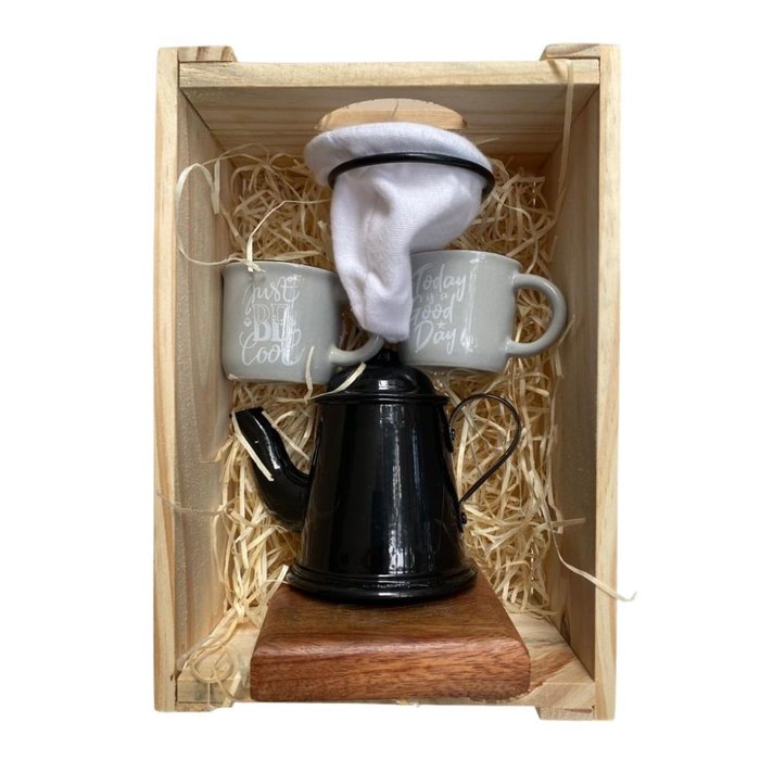 Esse kit é composto pela base madeira de demolição, coador de pano, 2 (duas) canequinhas de ceramica e um bule, caixa de madeira para presente.