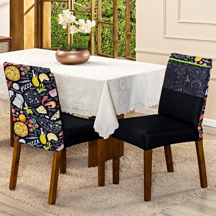 Kit de Capas de Cadeira Jantar Estampadas Ajustável com Elástico 04 Peças - Protetora Cozinha Malha Pizza Preto