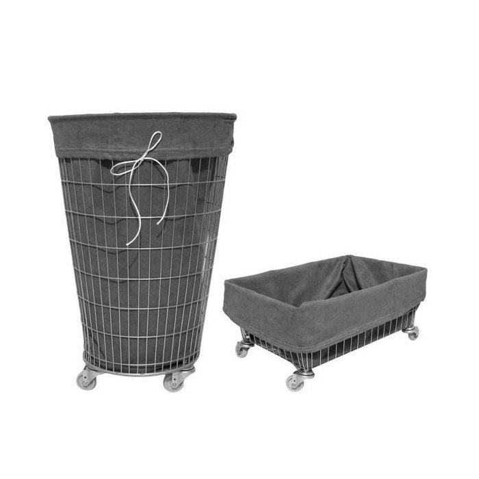 Kit de Cestos confeccionado em aramado de metal zincado, possuindo saco em tecido removivel e rodizios o cesto redondo mede 36x36x50 cm altura e o cesto retangular com rodizios mede 48x34x24 cm altura.