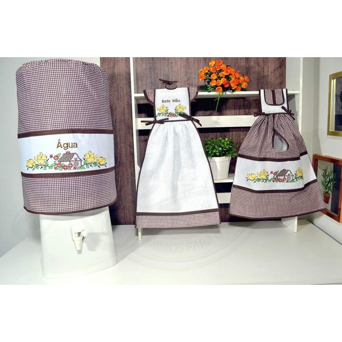 Kit de Cozinha 3 peças - Casinha Marrom Jogo prático e sofisticado, vai ficar lindo em sua cozinha! Kit fabricado com tecido xadrez, na cor branco e marrom , barrado bordado em ponto cruz de casinha e passarinhos e acabamento em viés na cor marrom.Seu dia a dia com mais elegância, cores e formas seguindo as principais tendências e novidades do mercado. A Linha da Arte & Tear possibilita renovação diária quando o assunto é servir bem. Os momentos especiais ficam muito mais alegres, além de proteger a sua mesa ou seu balcão, o jogo permite praticidade, sofisticação e proteção em apenas uma peça e deixará sua cozinha ainda mais preparada para receber sua família. Formado por:- 1 galão de água 20 L 0,40 x 0,29 m