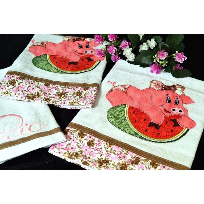 Kit de Cozinha Bordado Patchwork - Porquinha Linda porquinha em patchwork pra deixar a sua cozinha um charme! Com barrado de fllores nas cores branco, marrom, rosa e bege, detalhe no barrado com viés na cor marrom claro, bordado em patch work de uma linda porquinhana cor rosa, laço floral e marrom, e uma melancia nas cores verde, vermelho e preto, fabricado em tecido 100% algodão branco, no pano de pia o escrito bordado pia na cor rosa. Confeccionado em tecido de algodão, com grande facilidade de absorção. Mais beleza e conforto na hora de receber sua família e amigos. Você pode usar sua criatividade e deixar do seu jeito, deixando sua copa ou cozinha mais alegre no dia à dia. Eles vão dar um toque especial a sua casa. Então não perca tempo e deixe sua cozinha moderna e sofisticada. Essas peças tem como característica sua facilidade na hora da limpeza, o que lhe dará maior mobilidade no seu dia a dia. Aproveite esta maravilha. Formado por:1 pano de prato 0,67 x 0,45 m1 pano de pia 0,45 x 0,33 m1 bate mão 0,45 x 0,33 m Composição:100% algodão