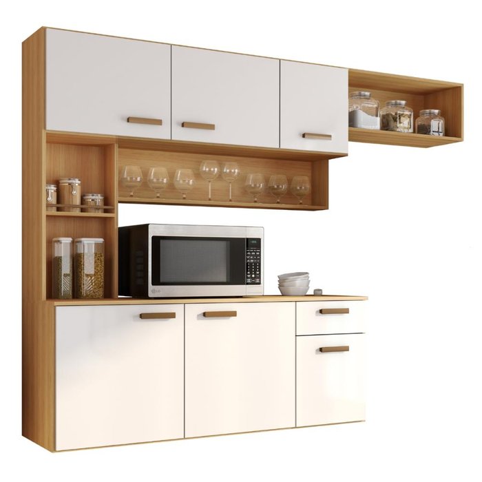 O Kit Cozinha suspenso destaca-se por sua praticidade e eficiência de uso, podendo ser utilizado em qualquer ambiente ou até mesmo como complemento de cozinha. Estrutura em MDP 12mm. Possui 1 gaveta com corrediça metálicas, 6 portas, 3 nicho e 3 prateleiras Dimensões do Produto: Altura: 136 cm Largura: 180 cm Profundidade: 36 cm Informações do Produto: Cor:Freijó/Off Acetinado Gavetas: Sim (1) Corrediça metálicas Portas: Sim (6) Prateleira: Sim (3) Nichos: Sim (3) Puxadores: Sim (7) Polímero Material Principal: MDP 12mm Itens Inclusos: 1 Kit Cozinha Manual de Montagem Kit completo para montagem e manual de instruções Garantia: 3 meses contra defeito de fabricação Informações Adicionais: - Fotos meramente ilustrativas do produto no ambiente. - Os objetos que ambientam as fotos não acompanham o produto; - Verificar descrição e tamanho do produto antes da compra. - Avaliar a mercadoria no ato do recebimento e recuse em caso de divergência ou avarias. - Mantenha as informações de contato e endereço de entrega atualizados para entrarmos em contato caso necessário. - Limpar com flanela ou pano macio seco, não utilizar produtos abrasivos, desengordurantes, álcool ou solvente. Não expor o produto diretamente à luz solar e à umidade. * Sugerimos a contratação de um montador profissional para a montagem do produto. Não nos responsabilizamos por avarias causadas no ato da montagem. * Não nos responsabilizamos pela montagem e desmontagem do produto no ato da entrega e devolução, assim como os custos gerados nestas situações. * A transportadora entregará o produto no andar térreo do endereço de entrega. * Não nos responsabilizamos por subir escadas, corredores e elevadores ou transporte por guincho em apartamentos.