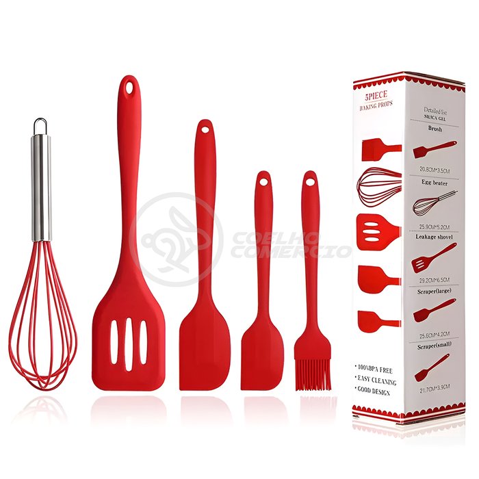 Kit de Cozinha Vermelho 5 Utensílios de Silicone com Peças Batedor Manual Espátulas Pincel Cor:verme