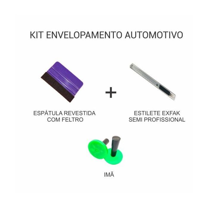 Kit de Envelopamento Automotivo. Kit de Ferramentas Profissional Para Aplicação de Envelopamento Automotivo, para quem pretende começar no ramo de envelopamentos ou quem precisa realizar este trabalho. Kit Composto dê: 01 Espátula Revestida com Feltro 01 Estilete Exfak Semi Profissional 01 Par de Imã. Obs: O tom da cor do material pode variar da cor vista na tela devido a configuração de cores do seu monitor.