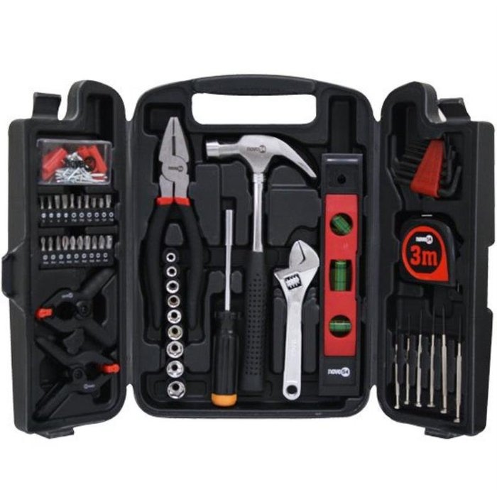 Jogo kit ferramentas com 131 peçasComposição: Alicate universal 8" - Aço carbono - Cabo plastificado Cabo adaptador de encaixe 1/4" magnético Bits - ponteiras: Fenda (3,4,5 e 6 mm); Phillips (nº 0,1,2 e 3) Pozidrive (nº 1 (2), 2(2) e 3(1)); Torx (T10, T15, T20,T25, T27 e T30) Adaptador magnético encaixe 1/4" Chave ajustável 6" - aço carbono Martelo unha 23mm - cabo metálico emborrachado Parafusos, buchas e pregos (80 peças) Trena 3M Chaves allen 1,5 a 8 mm (1,5- 2,0 - 3,0- 4,0 - 5,0 - 6,0 e 8,0mm) Chave de precisão de fenda - aço carbono (2,0 - 2,4 e 3,0mm) Chave de precisão phillips - aço carbono (2,0 - 2,4 e 3,0mm) Soquetes - aço carbono- encaixe: 1/4" (5, 6, 7, 8, 9, 10, 11, 12, e 13mm) 2 grampos 4" (plástico) Nível 9" (plástico)Marca: NOVE 54 NOVE 54-3599131000