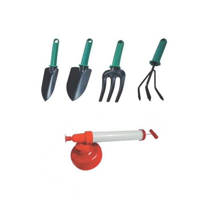 Kit De Ferramentas Para Jardinagem Jardim Pequeno Contém 5 produtos: 4 MINI FERRAMENTAS PARA JARDIM Jogo de mini ferramentas para jardinagem, corpo em aço carbono estampado, pintura eletrostática preta, cabo ergométrico injetado em polipropileno direto na peça, com uma pá estreita, uma pá larga, um garfo de 3 dentes e um rastelo (ancinho) de 3 dentes, comprimento total aproximado 250 mm. Pulverizador manual 350 ml, com pressão direta, bombeamento com pistão interno metálico, corpo em plástico de alta resistência e grande durabilidade, diâmetro do copo 100mm, comprimento total 280 mm. baixo desgaste, fácil limpeza e manutenção, proporcionando grande economia do produto, para umidificação e aplicação de inseticidas, fungicidas, fertilizantes foliares, etc. Qualidade Garantida Lotus