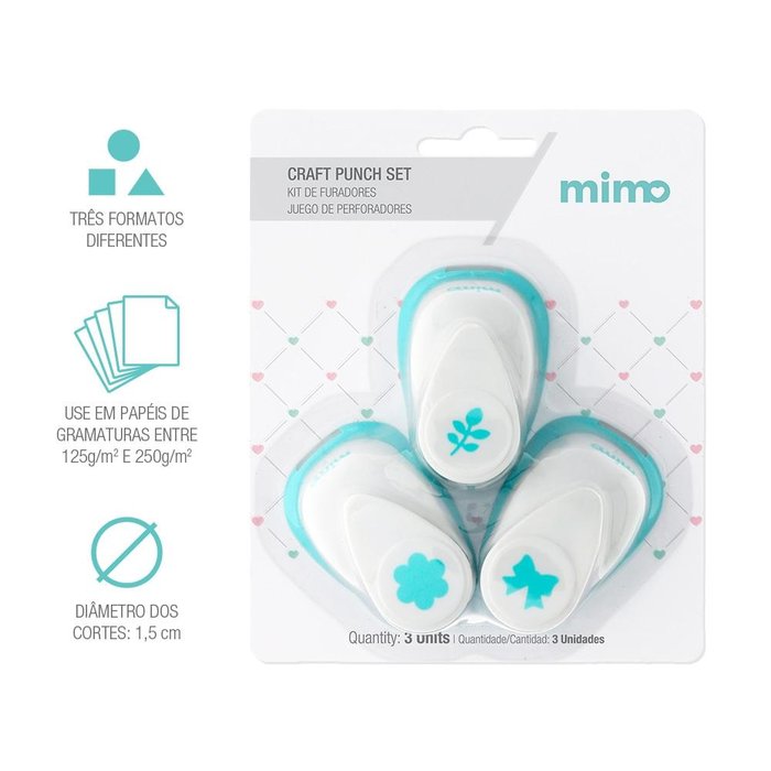 Furador de Papel 3 em 1Fure flor, folhas e laço incríveis e perfeitos em diversos tipos de papéis de forma muito rápida com esse Kit de Furadores - Mimo - 3 Unids. Ele é um kit 3 em 1, pois vai com 3 furadores que cortam papel nesses 3 formatos diferentes em segundos. Ou seja, com os furadores para papel desse kit, você cria cortes personalizados e lindos com diâmetro de 1,5 cm. Eles são recomendados para furar papéis com gramatura de 120g a 250g, uma folha por vez.Furador de Papel para ArtesanatoCom esses furadores de papel Mimo, você cria flor, folhas e laço ideais para personalizar diversos tipos de artesanatos, como cartões, scrapfesta, envelopes, convites, peças de scrapbooking, encadernação, presentes, entre outros, por exemplo.Os Círculos feitos com o Kit de Furadores de Flor, Folhas e Laço - Mimo - 3 Unids servem ainda para customizar os seus projetos de artesanato com sua marca, por exemplo. O resultado é incrível, bem preciso e a furação é bem rápida e simples de fazer.Informações Técnicas