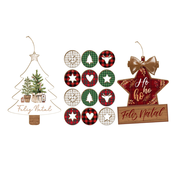 Tamanhos: 19x28cm Estrela (01 und.), 6,5x6,5cm Cada Enfeite (Embalagem com 12unds.) e 19x28cm Árvore com recorte (01 und.)