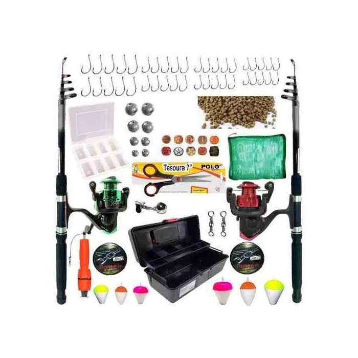 Kit Pesca 1 Vara 2,10m E 1 Vara 1,80m 1 Molinete 3000 E 1 Molinete 1000 DESCRIÇÃO TÉCNICA e ESPECIFICAÇÕES: Kit Pesca 1 Vara 2,10m E 1 Vara 1,80m 1 Molinete 3000 E 1 Molinete 1000 Este Kit de pesca foi montado pensando em oferecer a você pescador um conjunto básico de itens. Acompanha maleta e estojo para organizar suas tralhas de pesca e oferecer novas opções para a captura do peixe, garantindo sua diversão. Kit de pesca completo montado para auxiliar o amigo pescador que está iniciando, temos um ideal de todo o material de pesca básico mas ao mesmo tempo completo com os artigos de pesca que mais se utiliza seja em rios, represas ou pesqueiros. Este Artigo de Pesca básica vem o necessário para já sair pescando, com este kit de pesca você terá uma grande diversão e o início de sua tralha de pesca para poder se divertir e pegar muitos peixes. Assim que vamos pescando com este kit de pesca básico e nos aprimoramos conseguimos ir melhorando nossos artigos de pesca e temos tudo o necessário para que você monte e aumente ainda mais sua tralha de pesca. Temos itens do básico ao profissional e uma experiência dividida por vários pescadores de muitas partes do país. Esta tralha de pesca e outros kits básicos ou completos que temos na nossa loja de pesca é diversão garantida. DESCRIÇÃO DOS COMPONENTES DESTE KIT DE PESCA 01 Vara Telescópica 2,10m 100% Fibra de Vidro para molinete , Cabo Anti Deslizante, passadores em cerâmica, Em 6 Gomos, medindo 65 cm cada uma, facilitando o armazenamento e transporte. Indicada para peixes até 7 Kilos Ação Média. 01 Vara Telescópica 1,80m 100% Fibra de Vidro para molinete , Cabo Anti Deslizante, passadores em cerâmica, Em 5 Gomos, medindo 65 cm cada uma, facilitando o armazenamento e transporte. Indicada para peixes até 6 Kilos Ação Média. 2 carretel com 100m de Linha 0,30mm, monofilamento em nylon, super resistente a fricção. 13 lbs 01 Molinete Sol Marine Sports 1 rolamento, sistema balanceado, relação de recolhimento 5.1:1, carretel em plástico, super leve e macio para uso. Capacidade de linha 0,20mm 150 m 0,25mm 125m 0,30mm 100m 01 Molinete Araguaia 3000 Xingu com 3 rolamento, sistema balanceado, relação de recolhimento 5.1:1, carretel em plástico, super leve e macio para uso. Capacidade de linha 0,20mm 300 m 0,25mm 195m 0,30mm 135m 01 Maleta resistente em polipropileno com alça para transporte. Possuí bandeja basculante. Pode ser colocado cadeado. Medindo 31x15x13cm 01 Estojo em polipropileno com 8 divisórias. Um ótimo organizador para facilitar sua pescaria, podendo guardar anzois, giradores, miçangas, chumbadas, grampos, boias e outros. Medindo 12,6cm x 9,5cm x 2,6cm 02 Chumbo de 1,5gr 02 Chumbo de 4,5gr 02 Chumbo de 7gr 02 Chumbo de 15gr 02 Giradores simples em aço carbono nº5, super resistente. Utilizado para evitar torção da linha. 02 Boia em isopor colorida nº2 indicada para pequeno peixes. Também é utilizada para controlar a profundidade da isca em pesqueiros, lagos e represa quando colocada no chicote entre o anzol e a boia. Possuí passagem central com bastão de plástico para travar. 02 Boia em isopor colorida nº4 para pequeno peixes. Também é utilizada para controlar a profundidade da isca em pesqueiros, lagos e represa quando colocada no chicote entre o anzol e a boia. Possuí passagem central com bastão de plástico para travar. 02 Boia em isopor colorida nº5 para pequeno peixes. Também é utilizada para controlar a profundidade da isca em pesqueiros, lagos e represa quando colocada no chicote entre o anzol e a boia. Possuí passagem central com bastão de plástico para travar. 01 Boia de arremesso em isopor colorido indicada para peixes pequenos, médios e grandes. Também é utilizada para controlar a profundidade da isca em pesqueiros, lagos e represa quando colocada no chicote entre o anzol e a boia. 10 Miçanga com 1cm. Para fazer isca artificial muito utilizada em pesqueiros junto com boias cevadeiras ou boias de arremesso. Indicada para diversos tipos de peixes como Tambas, Tilápia, Matrinxãs, Carpas e outros. 10 Anzol em aço carbono Maruseigo, super resistente, niquelado/prateado, afiado a laser. Tamanho 6 - medindo 12mm por 5mm. 10 Anzol em aço carbono Maruseigo, super resistente, niquelado/prateado, afiado a laser. Tamanho 12 - medindo 15mm por 7mm. 10 Anzol em aço carbono Maruseigo, super resistente, niquelado/prateado, afiado a laser. Tamanho 16 - medindo 28mm por 11mm. 10 Anzol em aço carbono Maruseigo, super resistente, niquelado/prateado, afiado a laser. Tamanho 22 - medindo 33mm por 13mm. 01 pct Ração Furadinha Massa Pau no Gato com óleo de peixe, óleo de salmão, essencia e atrativo. Turbine sua pescaria com este item. 01 Sinete/Alarme de Espera para varas. 01 Tesoura 17,8 cm. Item útil na sua pescaria para cortar linhas, iscas etc 100m de Linha 0,30mm, monofilamento em nylon, super resistente a fricção. 13 lbs - 5,9kg. 01 Viveiro/Samburá para guardar seus peixes. Em nylon, tela de mosquiteiro. Tamanho M (31cmx17xm)