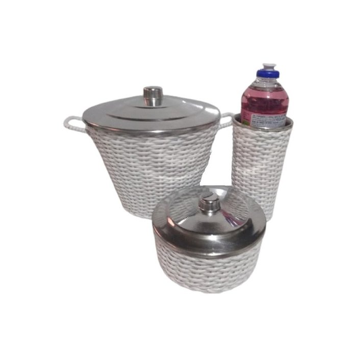 kit Pia Alumínio Em Fibra SintéticaCor: BrancoDescrição : Alumínio com revestimento em fibra sintética,MedidasLixeira: 19cm Diâmetro por 16cm de AlturaDetergente: 08cm Diâmetro por 15cm AlturaSabão em pedra:13 Diâmetro por 07cm Altura.Cor: Branco.