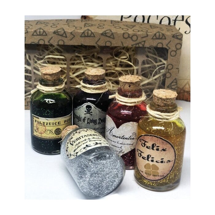O kit é composto por 5 poções, sendo elas: Felix Felicis (poção da sorte), Amortentia (poção do amor), Veritaserum (poção da verdade), Polissuco (poção da transformação) e Poção do Morto-Vivo e também acompanha um Guia de 4 páginas com informações sobre cada poção, ingredientes e modo de preparo.
