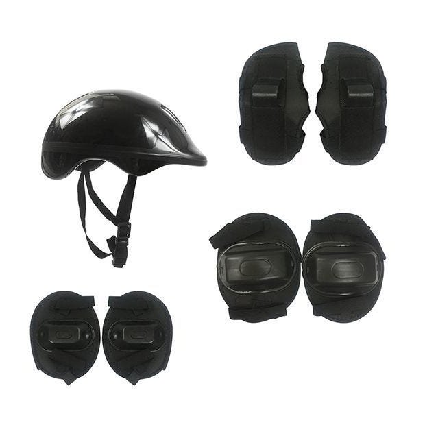 Kit de Proteção Infantil com Capacete Joelheira Cotoveleira Protetor de Mãos Indicação: maiores de 3 anos Tamanho aproximado: Capacete: 26X20cm Joelheira: 16X18cm Cotoveleira: 14X12cm Protetor de mão: 13X9cm Tamanho aproximado da embalagem : A:46XL:25cm Peso aproximado: 225g Cor: preto Composição: Plástico