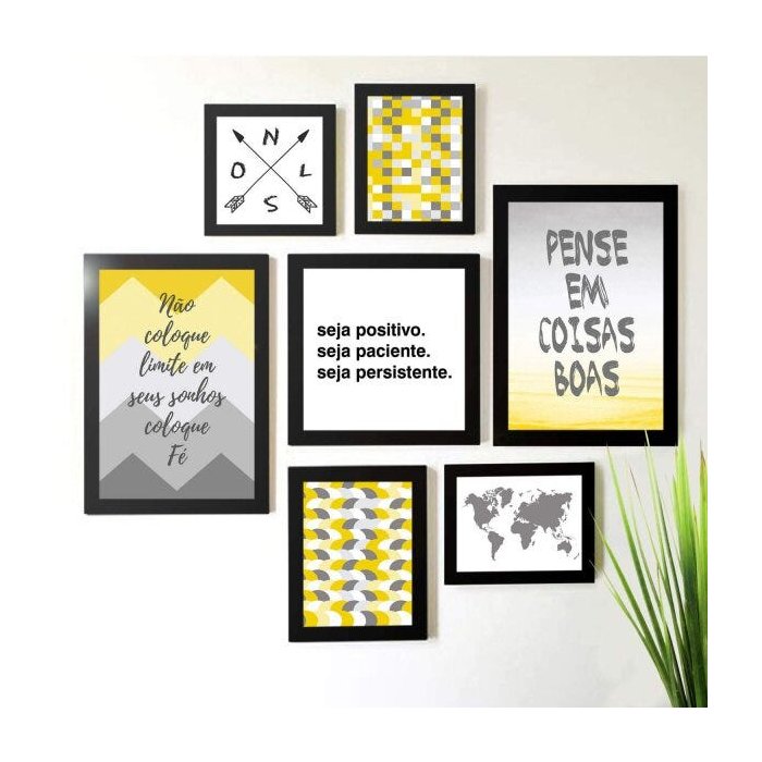 Kit de Quadros Decorativos 7 Peças Frases Abstrato Mapa Los Quadros Preto
