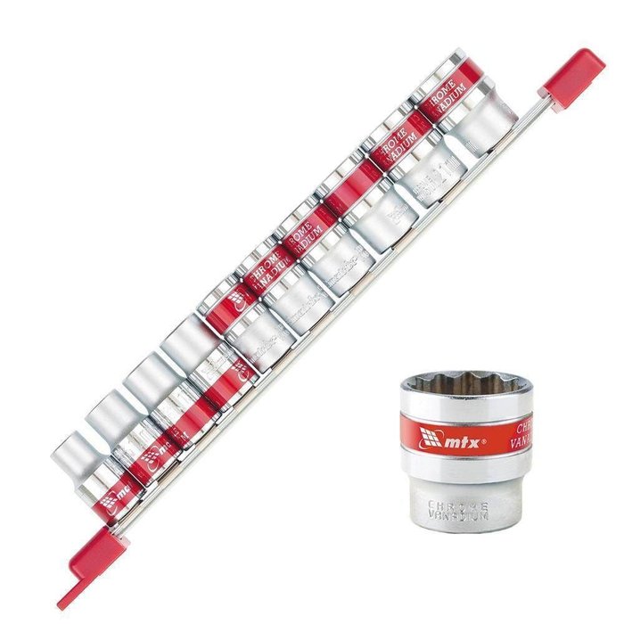 Kit De Soquetes Encaixa 1/2 Polegada 10 A 22mm Da Mtx. Soquetes Sextavados Em Aço Cromo Vanádio, Nas Medidas 10, 12, 13, 14, 15, 16, 17, 19, 21 E 22mm.