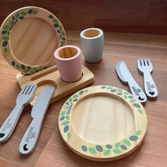 O Kit Utensílios conta com pratos, copos, talheres e um lindo suporte!