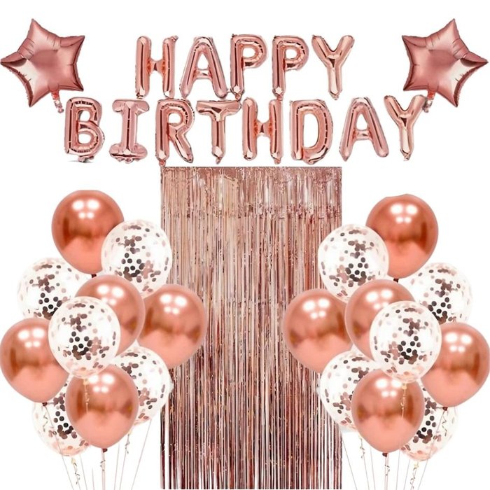 Conjunto de Balões Decorativos + Cortina Metalizada Rose Gold