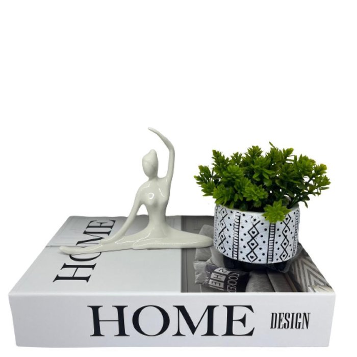 Nada mais encantador, original e inspirador do que utilizar livros na decoração de diversos ambientes, como salas de estar, escritórios, quartos, home office e onde mais sua imaginação permitir. Os livros decorativos são a mais nova tendência na decoração contemporânea e permitem diversas combinações e utilizações, dando um ar de sofisticação em mesas de centro, aparadores, prateleiras, escrivaninhas etc. Esse lindo livro estampa 'Home Design', irá encantar você pela riqueza de detalhes e qualidade no acabamento, junto do vaso de cimento artesanal preto e branco e mulher meditando de cerâmica na cor branca que dão um toque todo especial no ambiente.