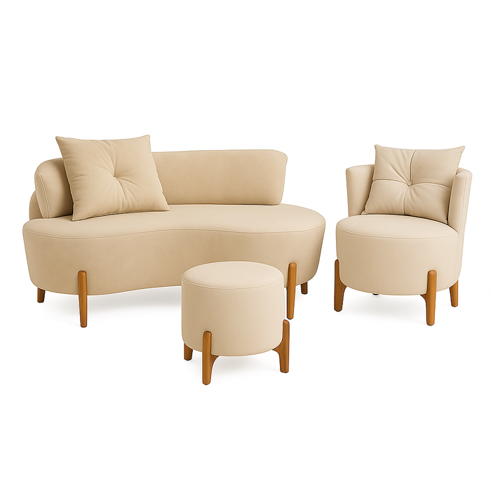 Este elegante kit de estofados traz um conjunto harmonioso composto por um sofá curvo, uma poltrona arredondada e um puff cilíndrico, todos com design orgânico e contemporâneo, ideal para ambientes que buscam sofisticação, conforto e personalidade.