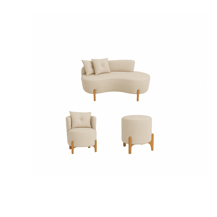 Este elegante kit de estofados traz um conjunto harmonioso composto por um sofá curvo, uma poltrona arredondada e um puff cilíndrico, todos com design orgânico e contemporâneo, ideal para ambientes que buscam sofisticação, conforto e personalidade.