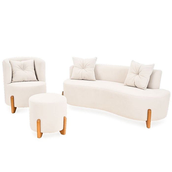 Este elegante kit de estofados traz um conjunto harmonioso composto por um sofá curvo, uma poltrona arredondada e um puff cilíndrico, todos com design orgânico e contemporâneo, ideal para ambientes que buscam sofisticação, conforto e personalidade.