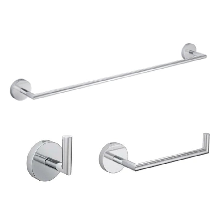 KIT DISCO CROMADO BASIC - DECA O Kit Disco Cromado Basic da Deca é a escolha perfeita para quem busca um toque de modernidade e funcionalidade no banheiro. Composto por uma papeleira, um porta toalha e um cabide, este conjunto combina design contemporâneo e praticidade.Características:Design Elegante: Com formas arredondadas e suaves, o acabamento cromado proporciona um visual sofisticado e atemporal.Durabilidade: Feito com materiais de alta qualidade, o kit é resistente à corrosão e ideal para o uso diário.Versatilidade: Perfeito para diferentes estilos de decoração, trazendo harmonia e estilo ao seu espaço.Fácil Instalação: Acompanha instruções claras para uma instalação rápida e descomplicada.Dê um upgrade na sua decoração e organização com o Kit Disco Cromado Basic da Deca, e transforme seu banheiro em um ambiente mais acolhedor e funcional!