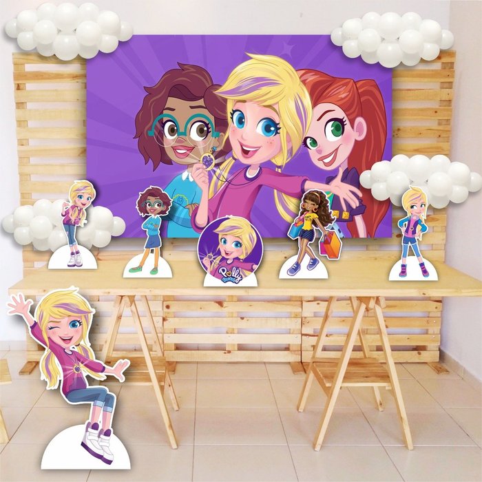 Kit display Decoração Polly Pocket + Painel Lona Impressa 1,50m x 1,00m