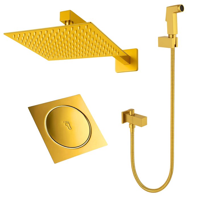 Kit Dourado Ducha Higiênica + Chuveiro Quadrado 20x20cm + Ralo 15x15cm Quadrado Dourado