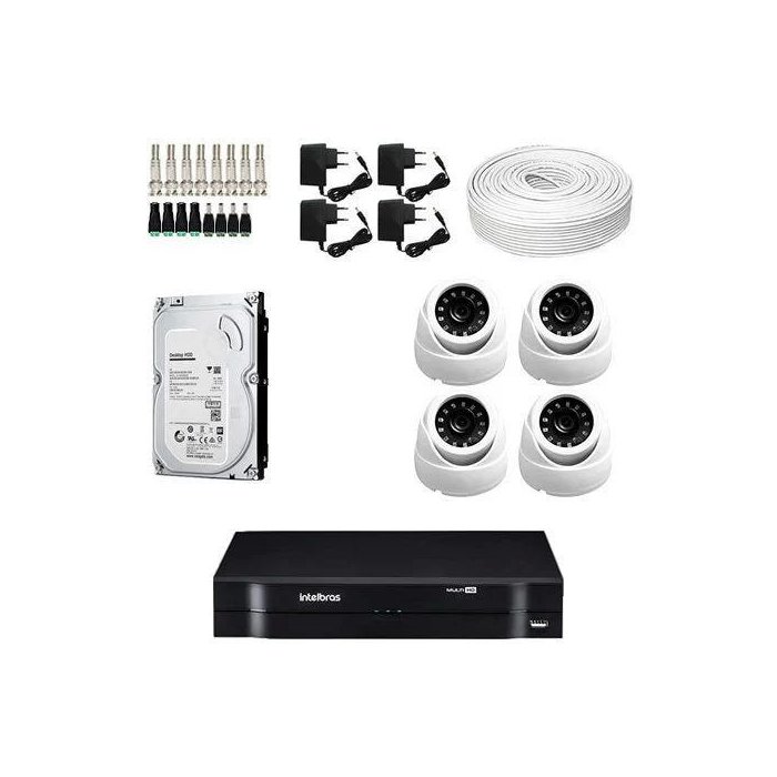 KIT DVR Intelbras + 4 Câmeras Dome AHD + HD + Acessórios