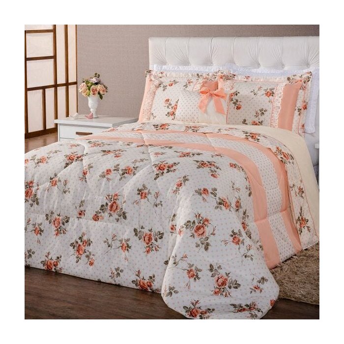 Kit Edredom com Almofada Alice Floral Salmão Queen 07 Peças