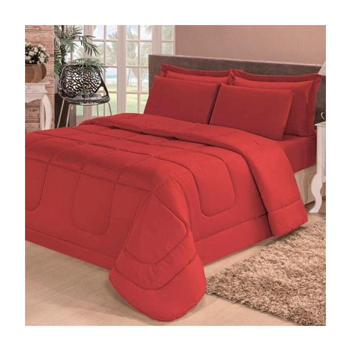 Kit Edredom Confort Casa Dona Dupla Face Casal Queen 6 Pçs com Lençol Vermelho Vermelho