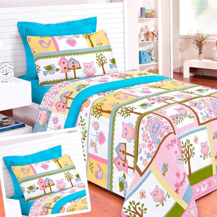 Kit Edredom Infantil Solteiro Estampado Coruja Feminino 5 Peças + Jogo de Cama Solteiro