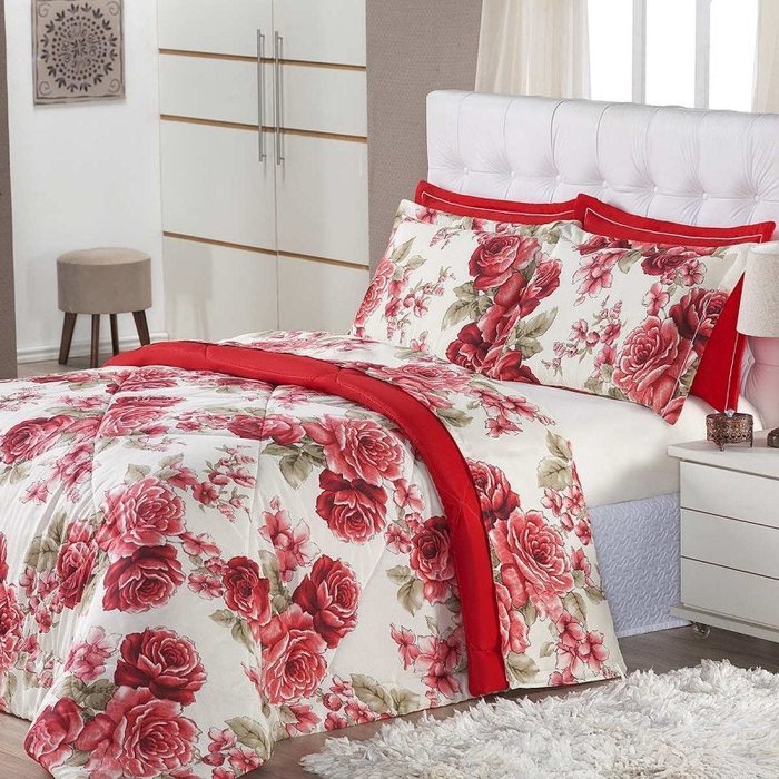 Kit Edredom Lérida Vermelho Queen Dupla Face 120 Fios 07 Pecas