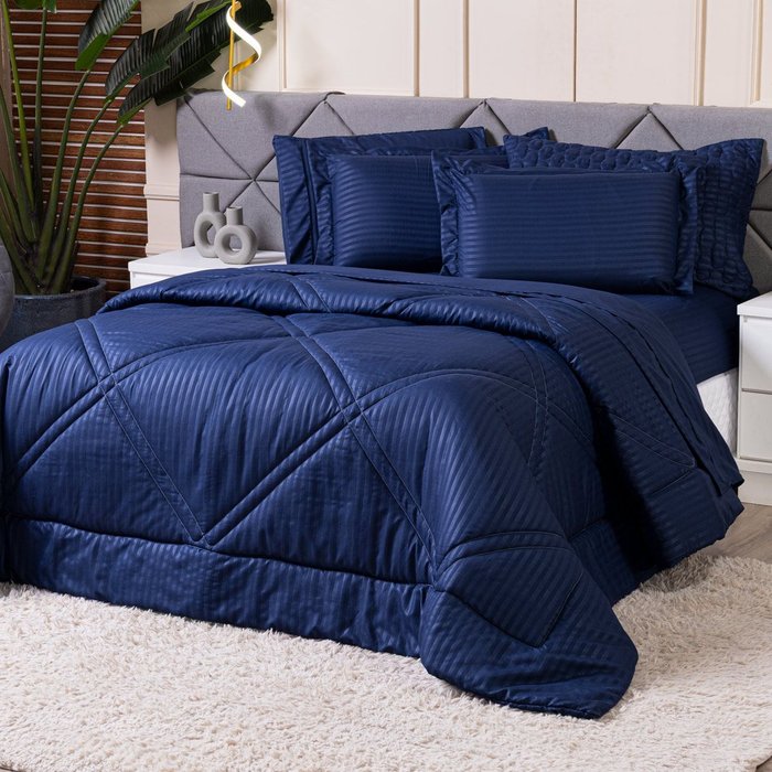 Kit Edredom Mônaco Fitado Percal Soft 300 Fios com Fronhas King 03 Peças - Dupla Face Listrado Aceti Azul Marinho