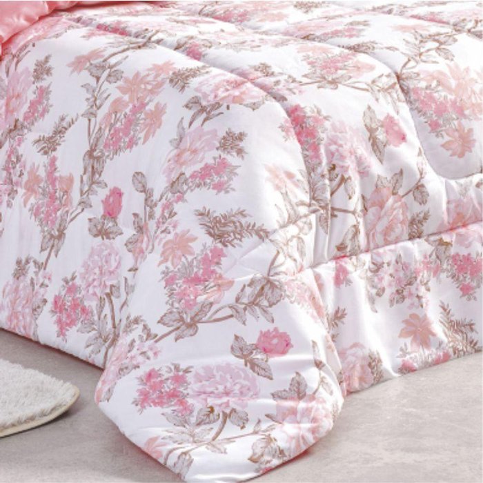 Kit Edredom Real Casal Super King Micro Percal 200 Fios 03 Peças Rosa Floral
