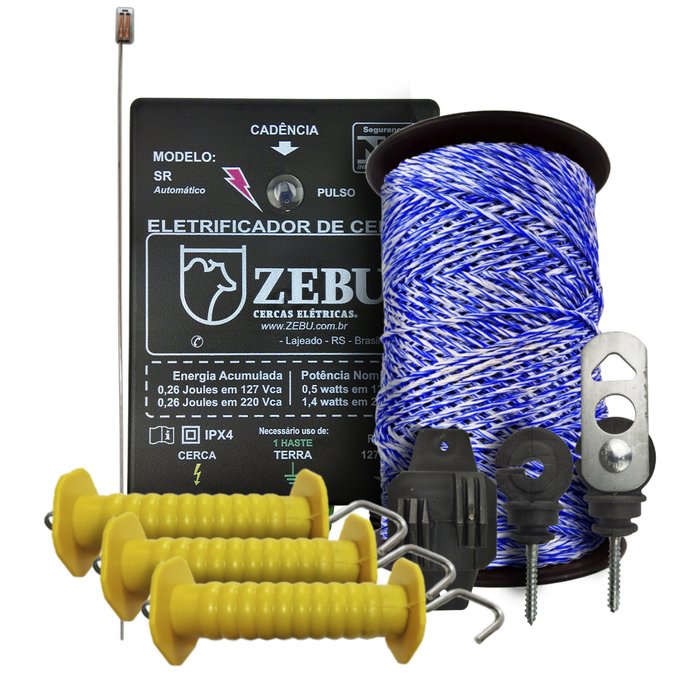Kit Eletrificador Rural Cerca Elétrica Gado Cães Gatos 1000m 01 - Eletrificador Zebu 0,26J80 - Isolador tipo W20 - Isolador Gancho Curto03 - Manopla de Porteira03 -Engate de Porteira1000 metros de fio Em caso de duvidas entre em contato conoscoDesde já, agradecemos a preferência.Equipe DF88!