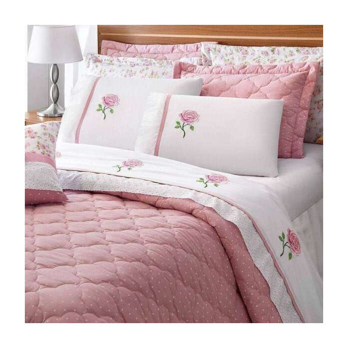 Kit Enxoval 7 Peças Cama Queen 200 Fios com Cobre Leito e Lençol + 5 Peças Estampas Poá e Floral Rosé